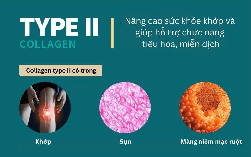Collagen Type II có cấu trúc đặc biệt với hai chuỗi gắn liền với nhau. Nó thường được tìm thấy trong sụn, đặc biệt là trong sụn khớp, giúp cung cấp tính đàn hồi cho mô sụn và bảo vệ khớp khỏi mài mòn.