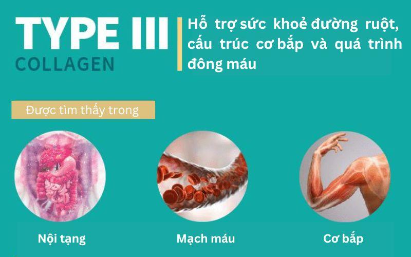 Collagen Type III thường xuất hiện cùng với Collagen Type I trong làn da và có cùng tác dụng làm đẹp da. Sự đàn hồi của da chủ yếu phụ thuộc vào sự kết hợp giữa Collagen Type I và Collagen Type III. Sự hiện diện của Collagen Type III trong da giúp giảm nếp nhăn và tạo sự dẻo dai, làm cho làn da trông trẻ hơn.