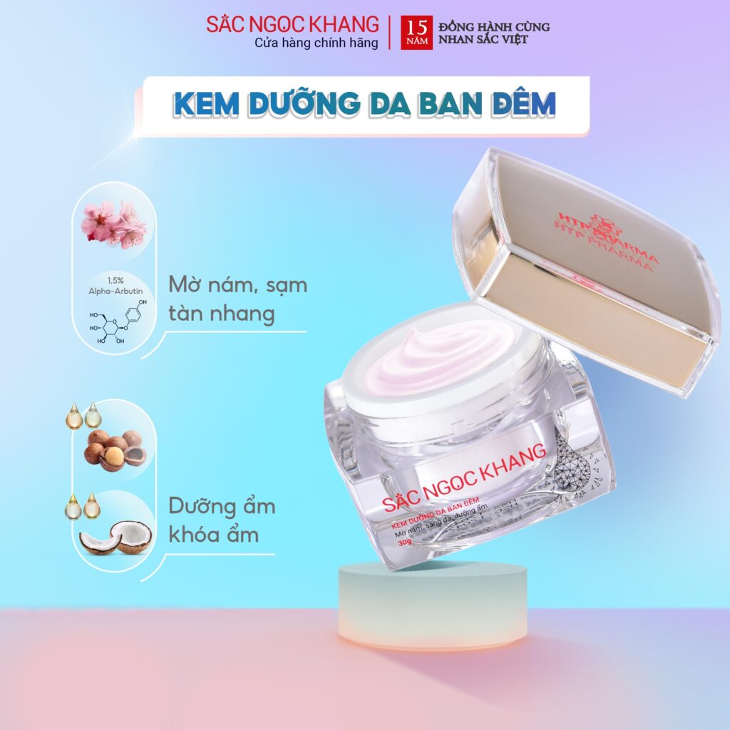 - Kem Dưỡng Da Ban Đêm Sắc Ngọc Khang 30g hỗ trợ dưỡng ẩm, làm mờ nám, sạm, tàn nhang.