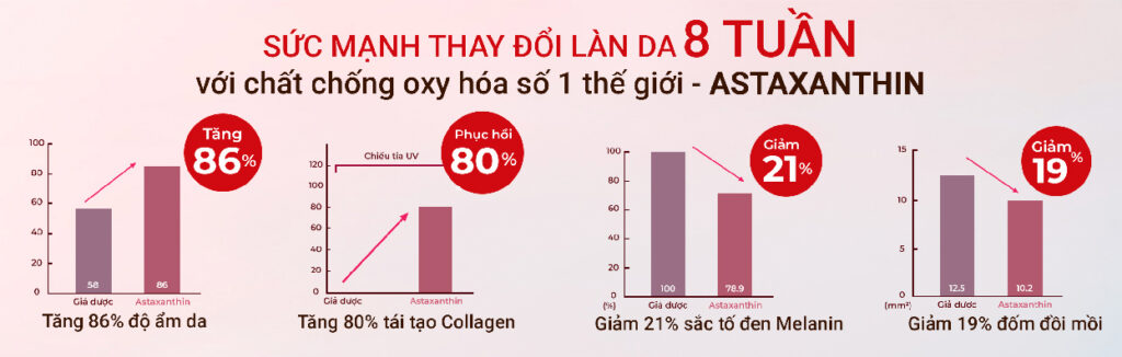 Đáng chú ý, sản phẩm còn có khả năng cải thiện da sau 8 tuần sử dụng Astaxanthin được chứng minh lâm sàng tại Nhật Bản: