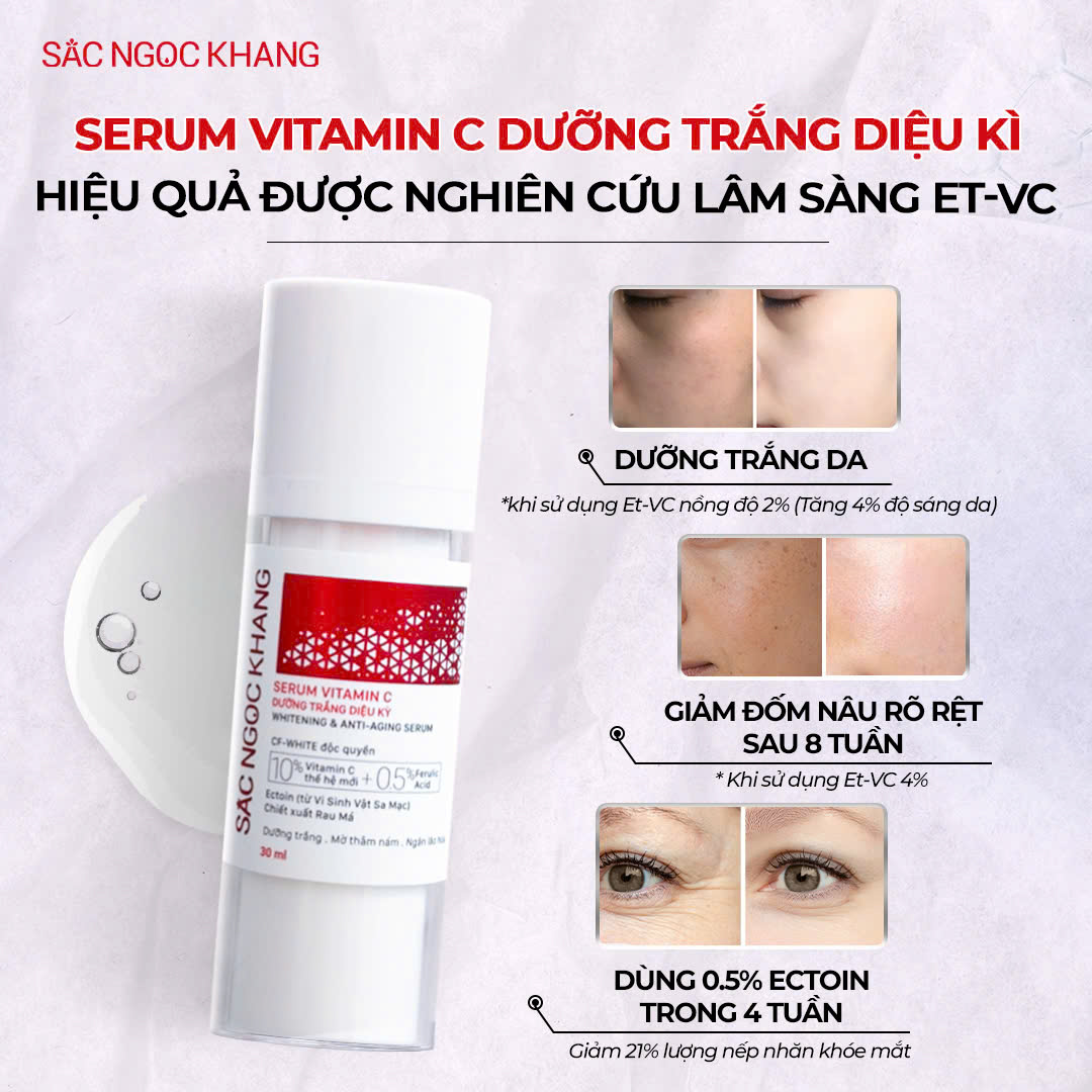 - Serum Vitamin C Dưỡng Trắng Sắc Ngọc Khang là sản phẩm tiên phong tại Việt Nam với công thức CF-White độc quyền. Sự kết hợp giữa 10% Vitamin C thế hệ mới và 0.5% Ferulic Acid giúp tăng cường khả năng dưỡng trắng, chống oxy hóa mạnh mẽ và bảo vệ Vitamin C khỏi sự oxy hóa khi tiếp xúc với ánh sáng, nhiệt độ, giữ cho serum luôn ổn định và hiệu quả lâu dài.
