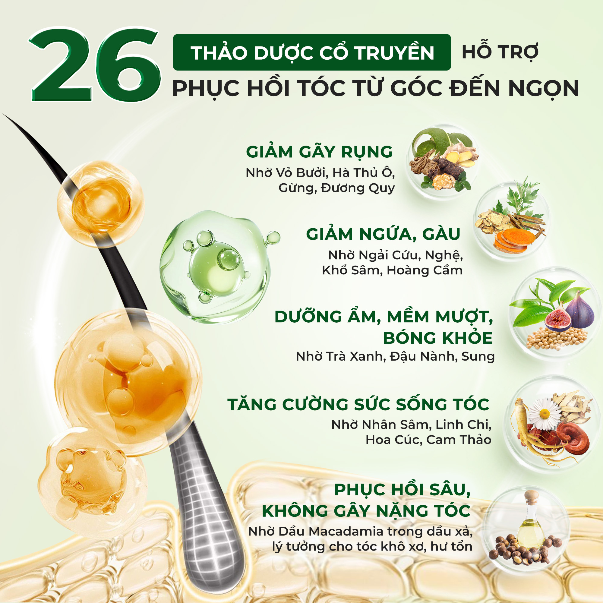 - 2 thảo dược chuyên sâu từ Việt Nam, hoàn thiện bản phối 26 vị quý, mang lại tác động sâu rộng và hiệu quả toàn diện trên cả da đầu lẫn thân tóc.
