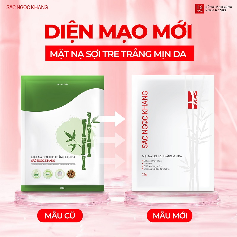 Kể từ hôm nay, Mặt Nạ Sợi Tre Trắng Mịn Da chính thức khoác lên mình “diện mạo” hoàn toàn mới, với sự kết hợp hài hòa giữa màu trắng sang trọng và sắc đỏ quen thuộc của Sắc Ngọc Khang. Từ đó giúp Nàng dễ dàng nhận biết và chọn mua đúng hàng chính hãng trên thị trường, cũng như nâng cấp trải nghiệm sản phẩm lên tầm cao mới, sang trọng hơn, hiện đại hơn
