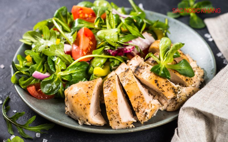 Lựa chọn: Salad cá hồi hoặc salad ức gà với nhiều loại rau xanh (rau bina, cải xoăn, xà lách...), thêm dầu oliu và giấm táo. Hoặc, bạn có thể ăn cơm gạo lứt với cá thu sốt cà chua và rau luộc.